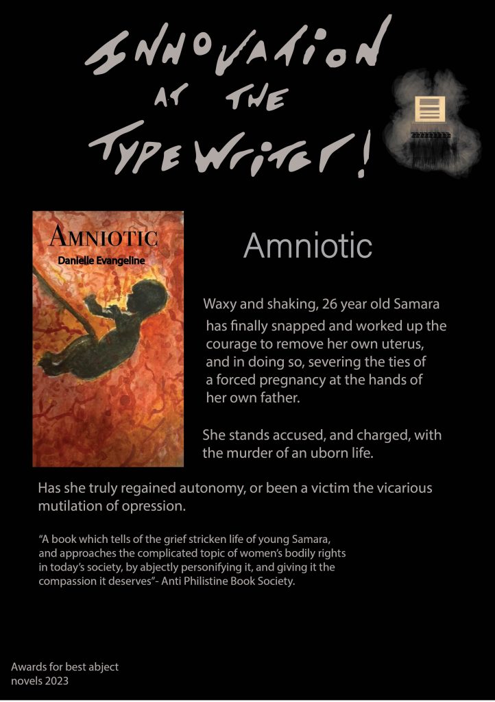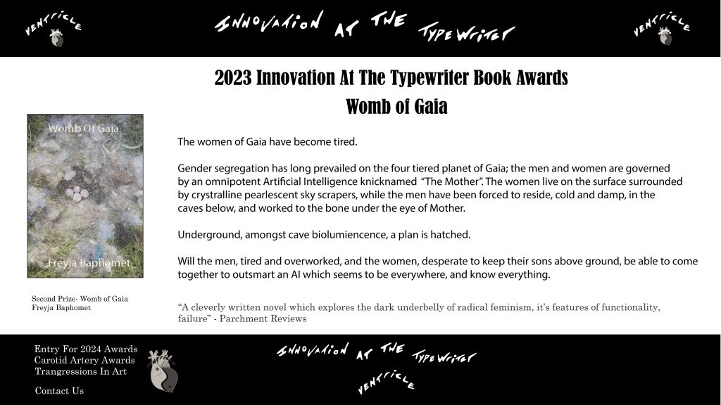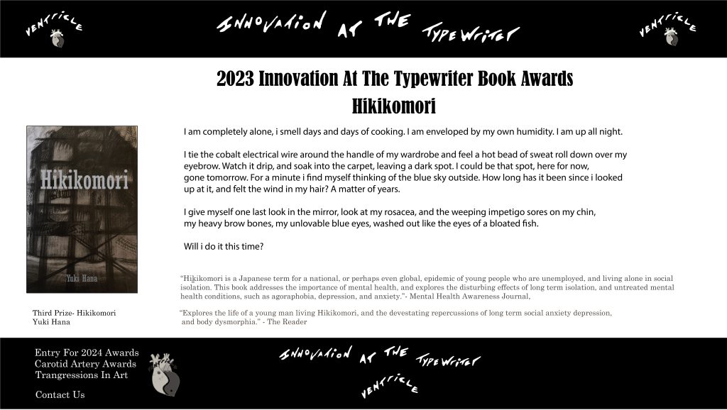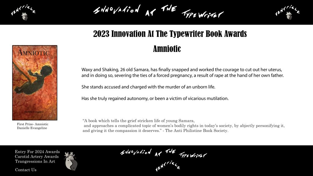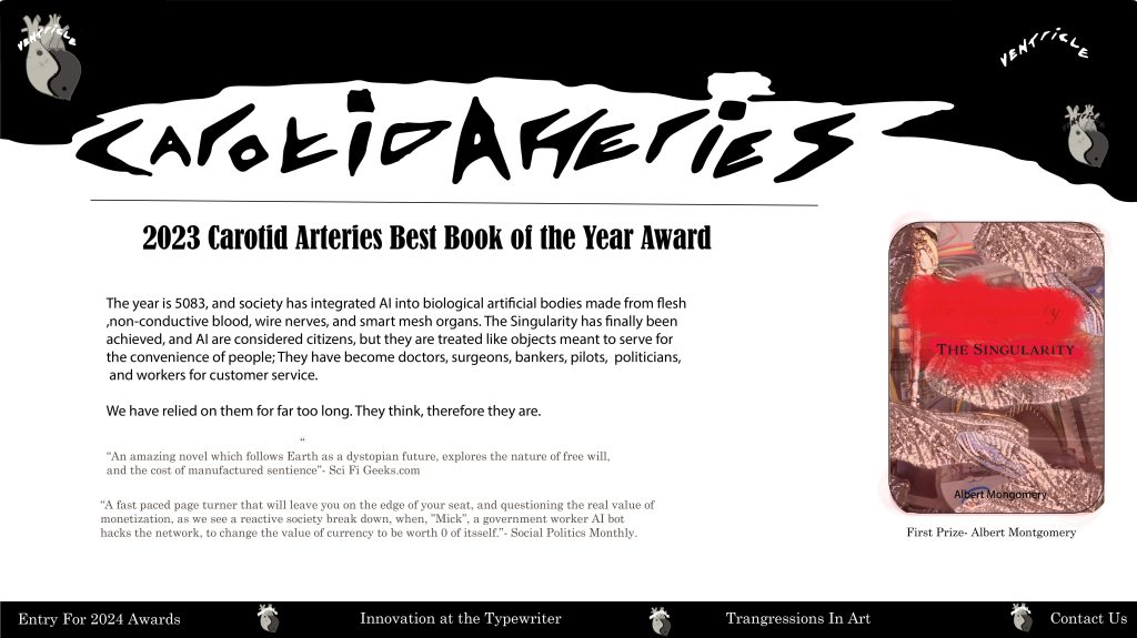 I decided to do two awards for my ‘books’, one for lesser awards ‘innovation at the typewriter’, and another one for a major award ‘carotid artery’. I named the major award carotid artery because it is the artery that carries blood to the brain, and it fell in line with the conceptual theme of my project, which is to celebrate the symbiosis of art, specifically abject horror in books.