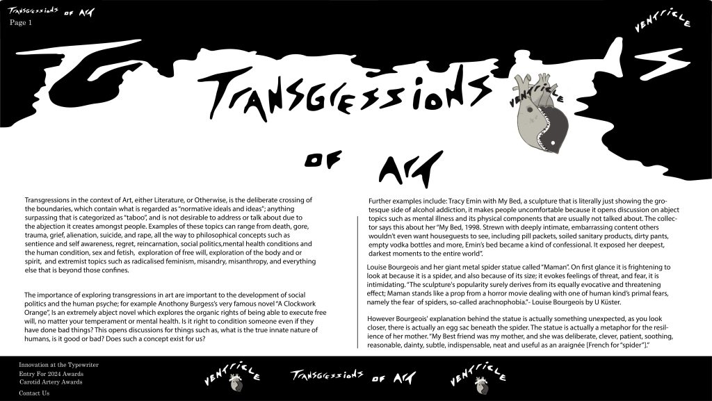 The second style of page follows the same colour scheme, and use of logo and slogan typography, however I used to casted shadows that came along with my hand drawn typography. I separated the typography from these shadows once they were vectorised, and used these as the banners because I think that it had some really awesome looking shapes, and added texture to the carotid artery page, and also to the transgressions in art explanations.