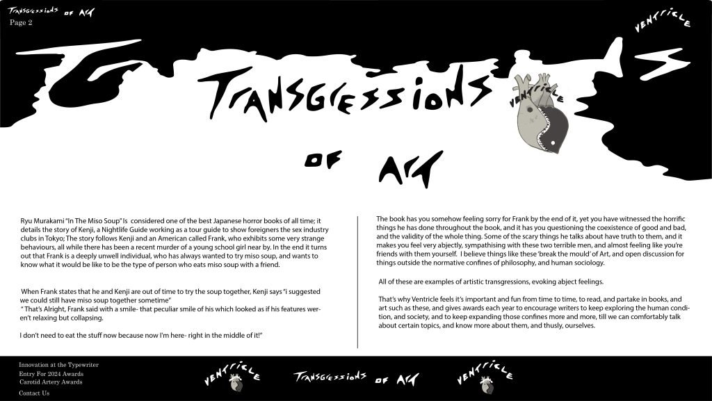 The blog has three pages for innovation at the typewriter, and one major award page, ‘carotid artery’, followed by two informative pages which explain my motive, concept, and the definition of what i have chosen as my topic ‘abject art’ as a propellant for human social-development. However, I think that because wordpress only allows embedded images to go a certain size, it could be a little hard to read the text on my editorial pages, which is a worry. In addition to this, I chose a medium quality to export these pages so they would fit on the wordpress site, and I worry this has degraded the quality of text also. I feel the pages would be more appropriate as an actual website so that the text and layout can be seen and read in the way it was intended.